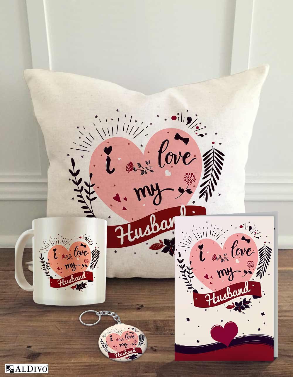 This is one of the best combos that come with a mug, cushion, card and key ring. The cushion comes with imprinted information that describes your feeling about your husband.